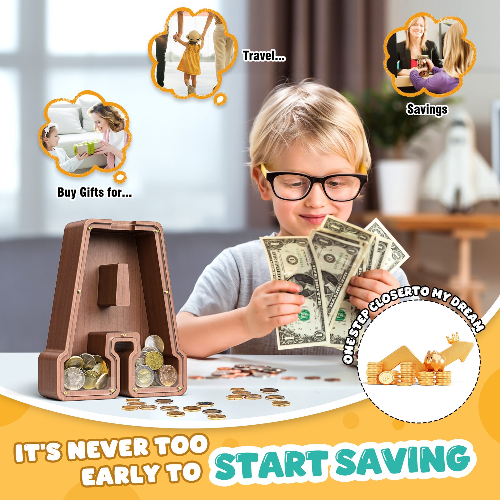 It’s way more than a cute decor piece—it’s a fun financial buddy for your child! Through daily saving challenge, kids naturally build financial literacy, fall in love with saving, and gradually develop healthy money habits that last a lifetime. Watching their “little treasure chest” grow is pure joy for them (and you)!