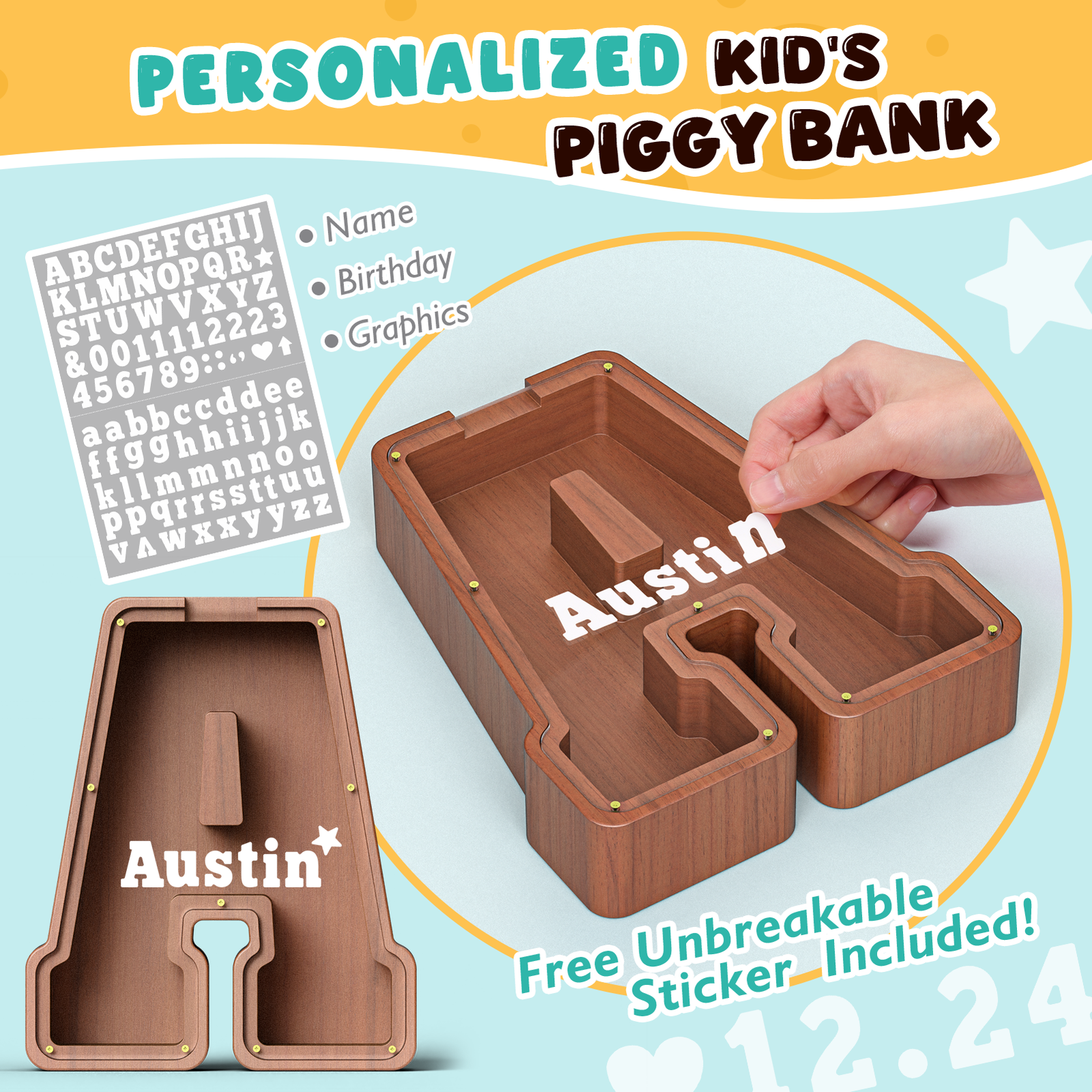 Please note that The picture aside is only for reference. Our designer will adjust the name size and font to match the piggy bank perfectly. 200characters max.